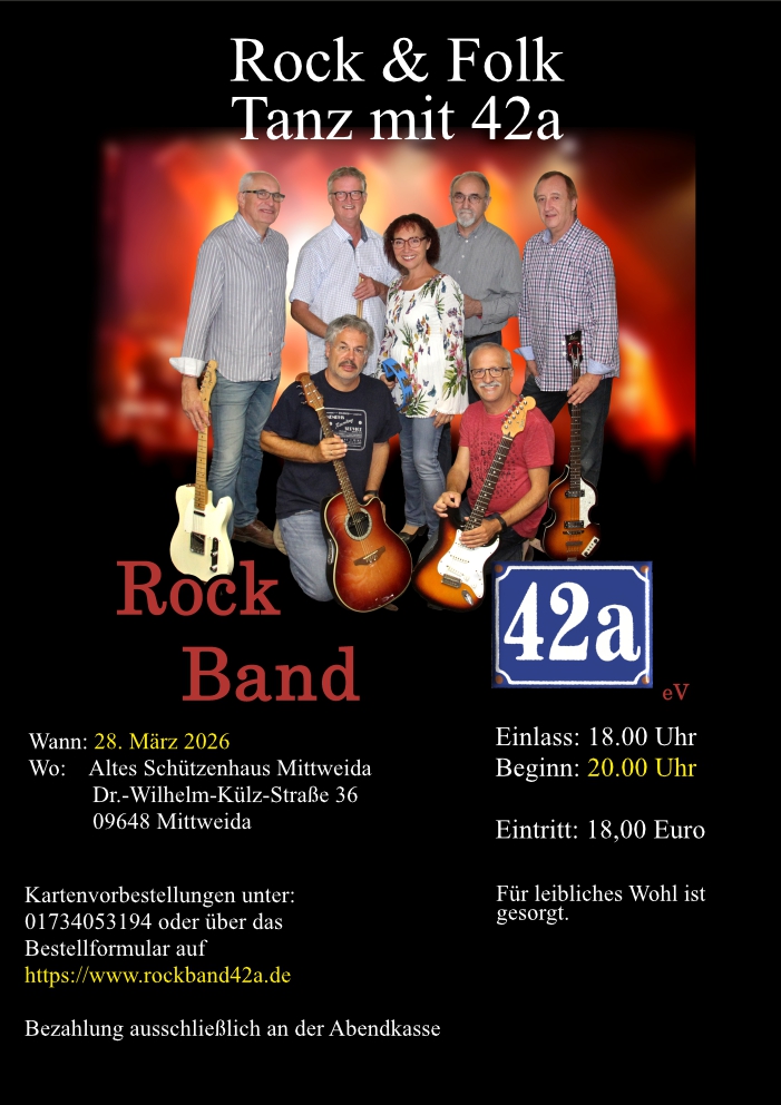 42a ist die Nummer des Hauses, in dem vor nun mehr als 20 Jahren einige musikbegeisterte Freunde sich entschlossen, eine Band zu gründen. Der Name war schnell gefunden -42a- und mit anfangs wechselnder Besetzung spielt die Band in der heutigen Aufstellung seit etwa 15 Jahren. Stücke von Gerhard Gundermann sowie auch selten gespielte Klassiker der Rockmusik gehören zum Repertoire. „Guter hand made Rock“ (Ecke Bauer) mit eigenwilligen Interpretationen sollen die Zuhörer überraschen. Wenn auch die Mehrzahl der Bandmitglieder Ärzte sind, wird der Begriff „Ärzte-Band“ nicht gern gehört. Andererseits ist es sicher auch mal schön anzusehen und zu hören, wenn mehrere Ärzte gleicher Meinung sind.